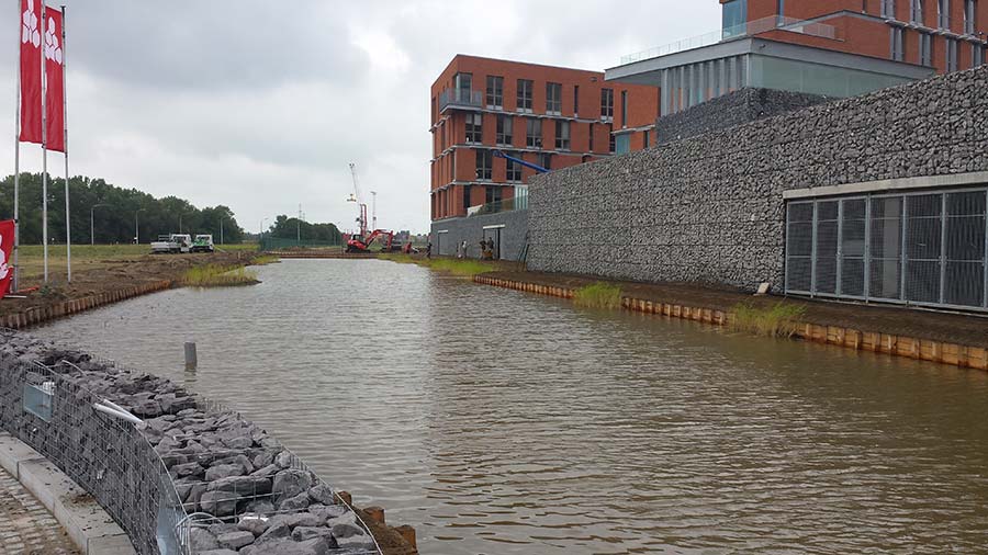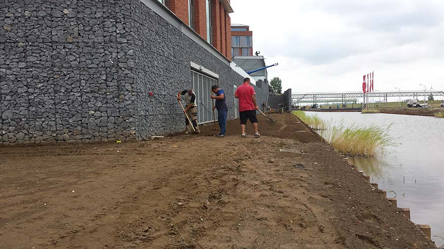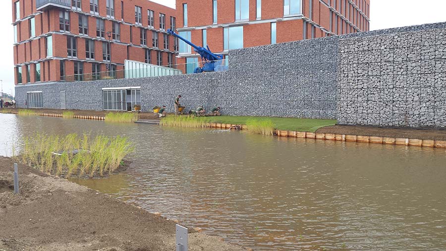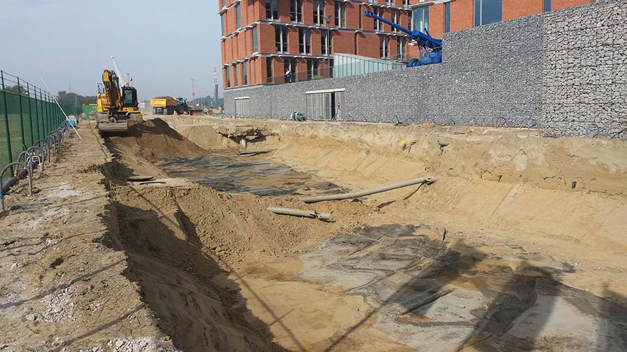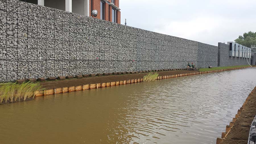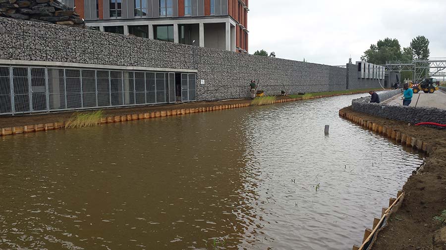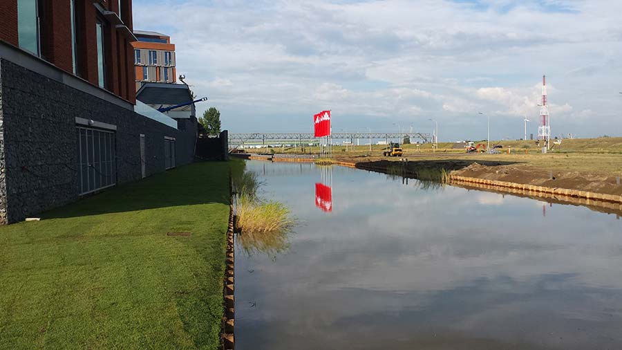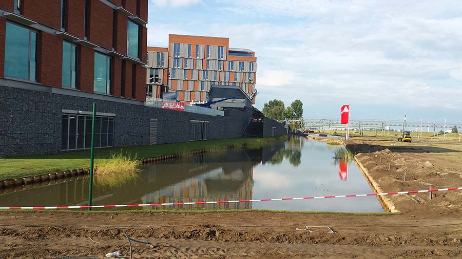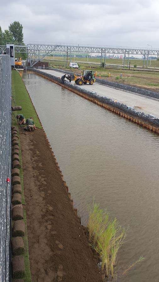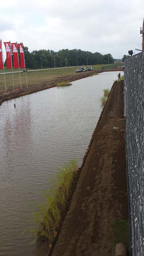 Voor de kantoren van Katoennatie in Kallo werd ons gevraagd een slotgracht te creeëren met een lengte van ongeveer 200 lopende meter en een breedte van 8 tot 14 meter. Zowel de grondwerken, het plaatsen van de folie als de houten randafwerking en graszoden werden door Geolock geplaatst.