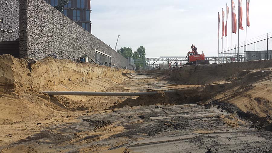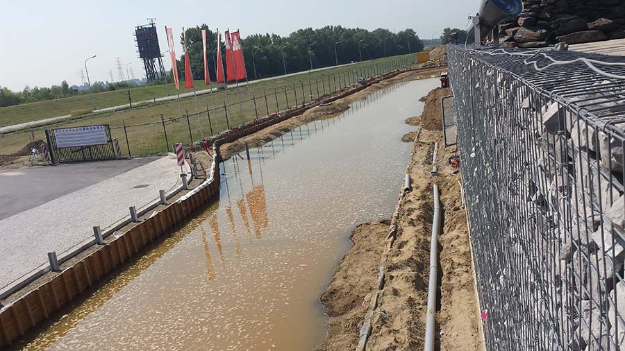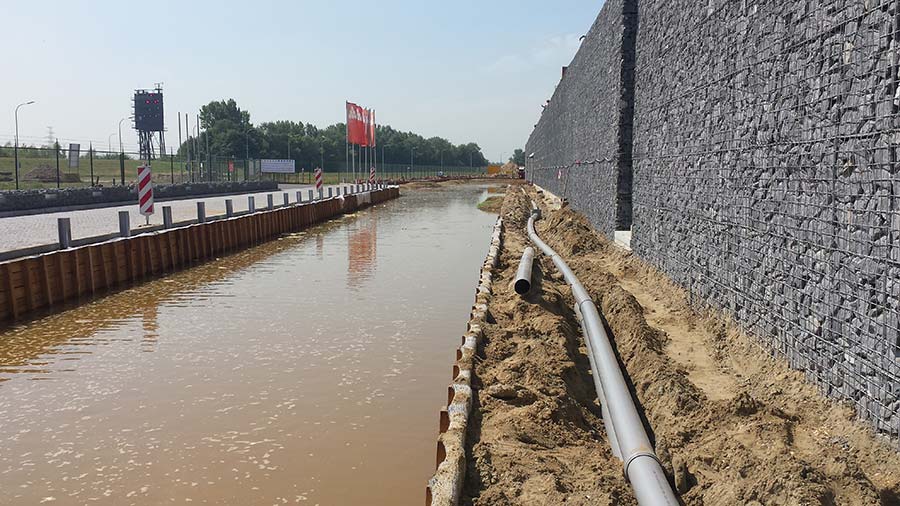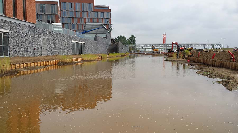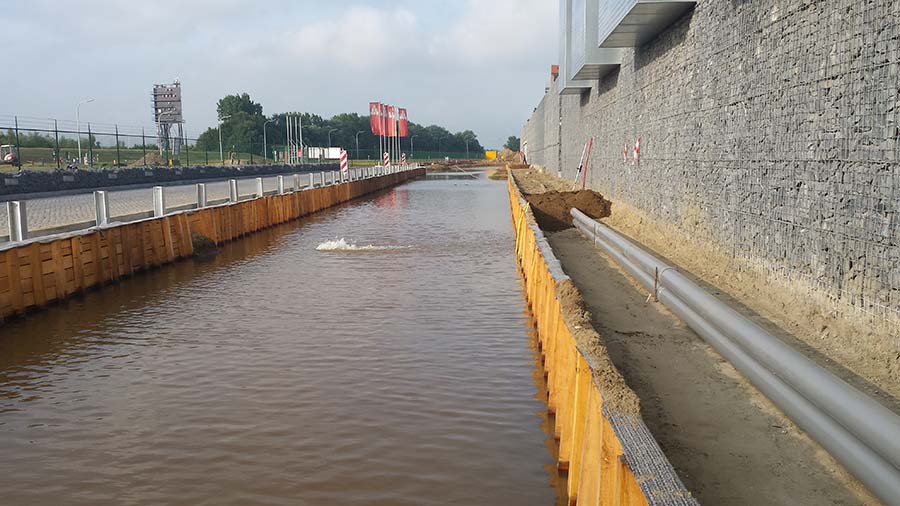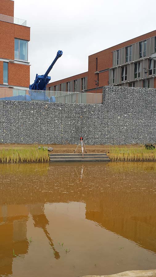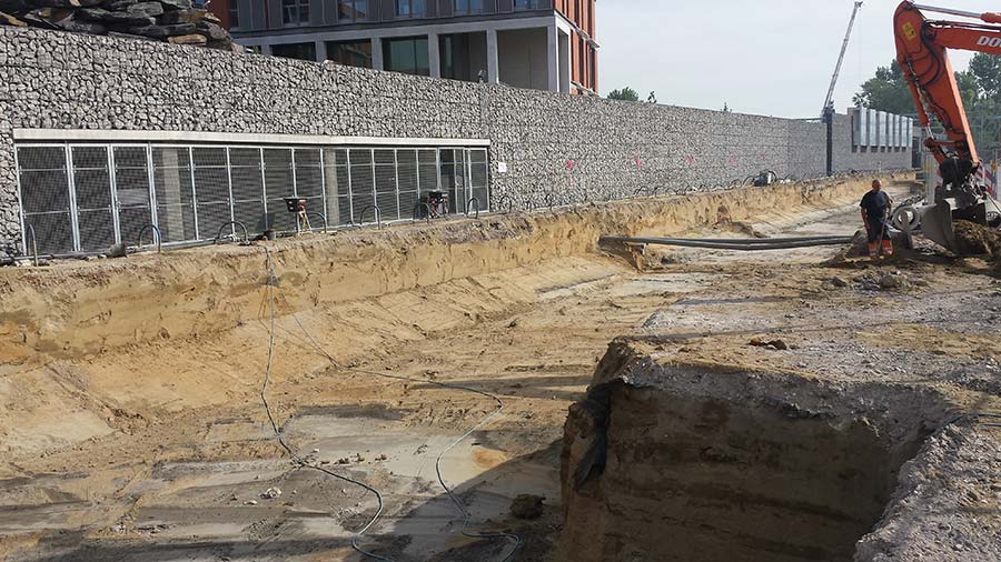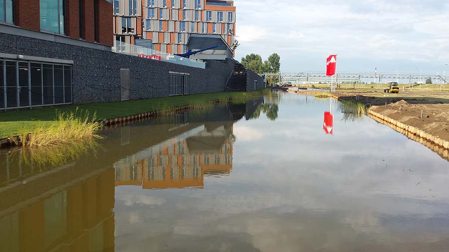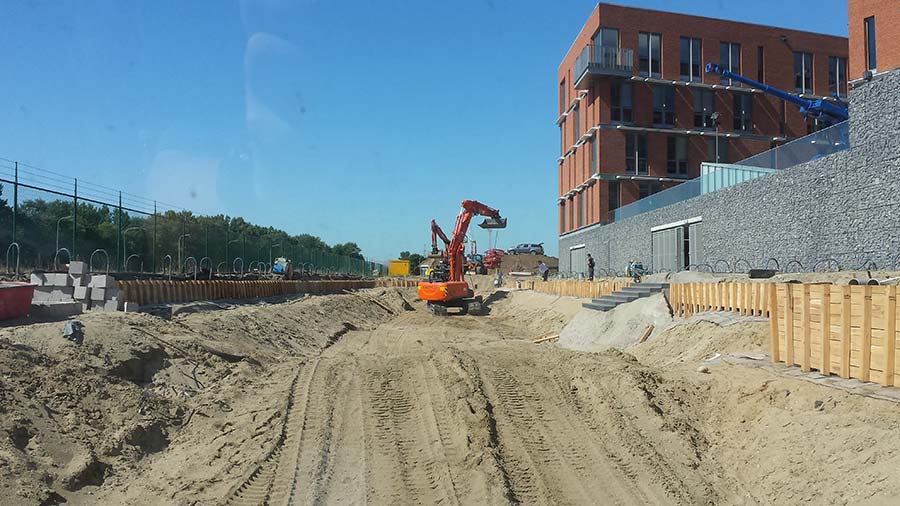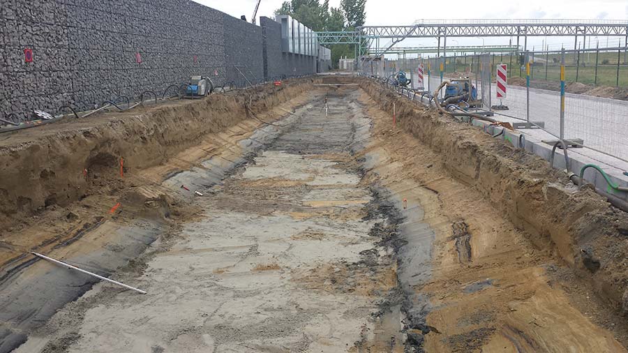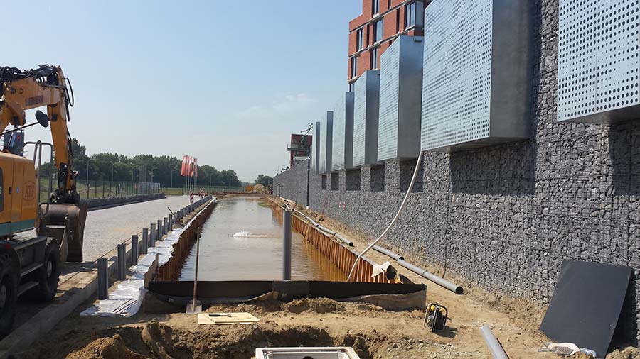 Voor de kantoren van Katoennatie in Kallo werd ons gevraagd een slotgracht te creeëren met een lengte van ongeveer 200 lopende meter en een breedte van 8 tot 14 meter. Zowel de grondwerken, het plaatsen van de folie als de houten randafwerking en graszoden werden door Geolock geplaatst.