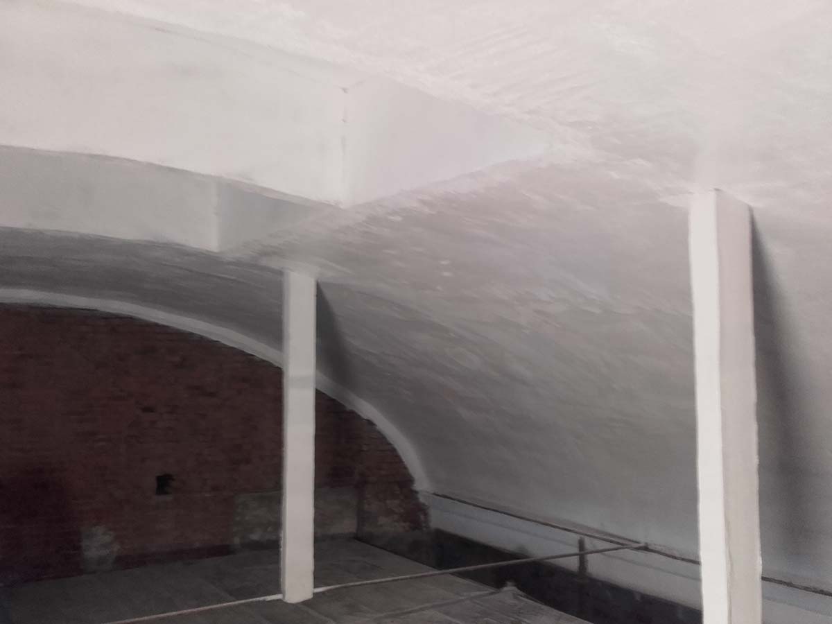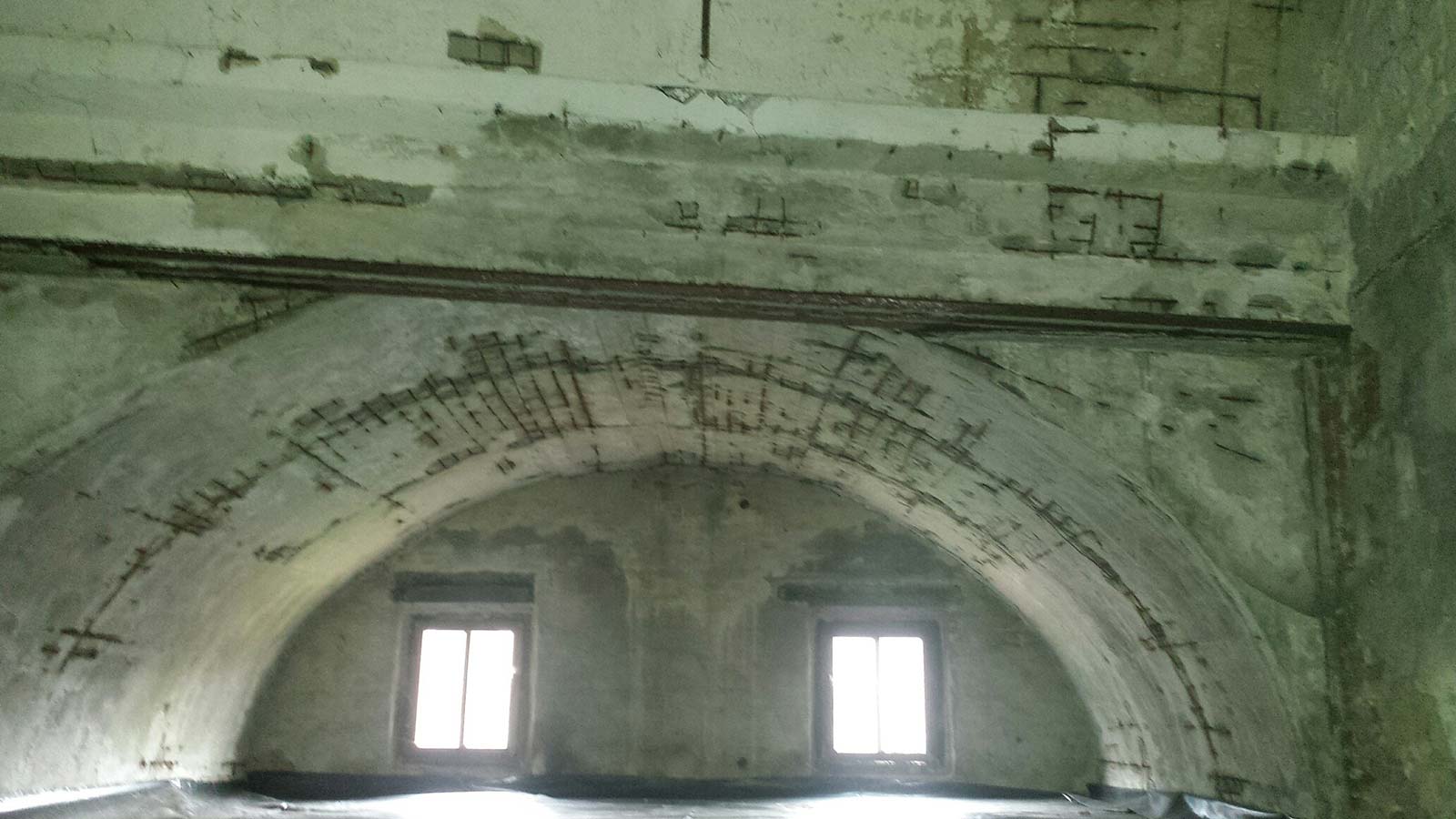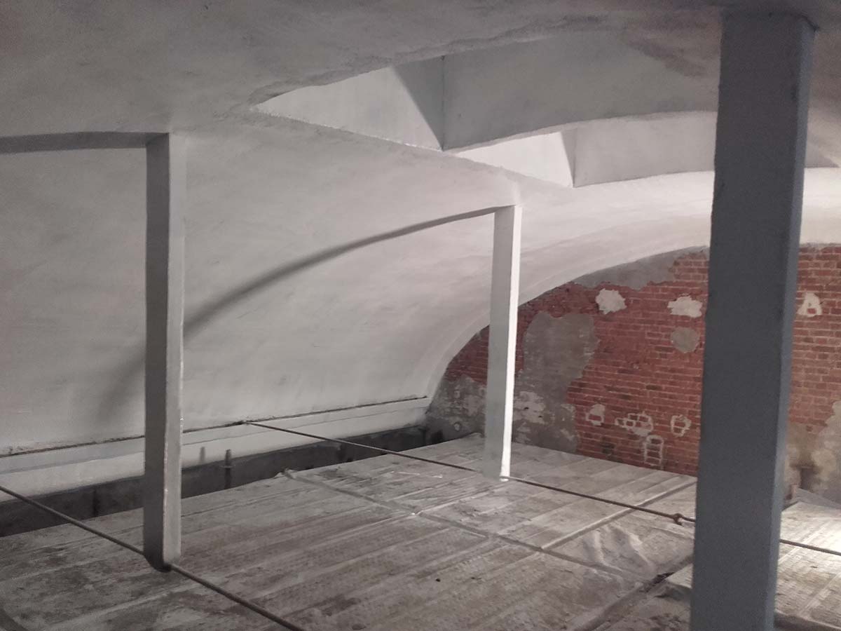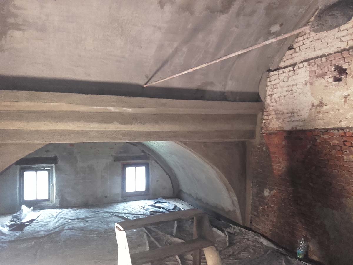In eerste instantie werd na een grondige reiniging met water/zandstraal techniek de binnenzijde van de koepel aangepakt. Een carbonatatie remmend product werd via impregnatie aangebracht .Hierna werd een eerste hechtlaag met vezelversterkte krimcompenserende mortel aangebracht.