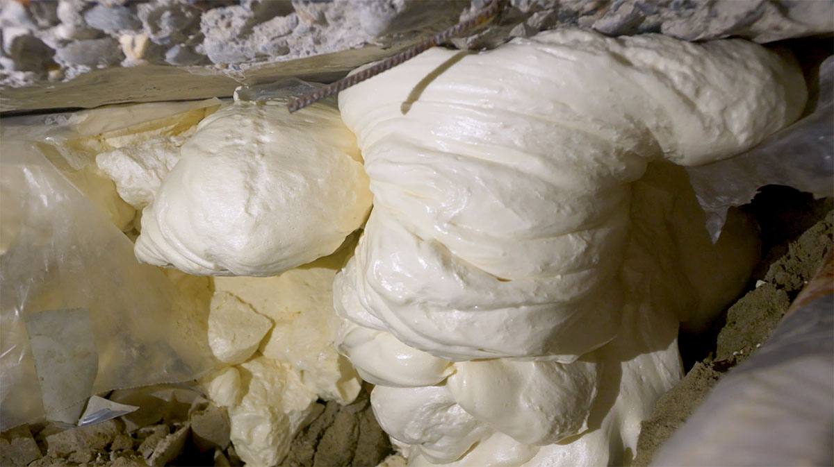 De werken werden uitgevoerd met een 2 componenten expansief hars die een zeer grote druksterkte heeft. Het hars neemt 30 tot 50 keer zijn eigen volume aan.
