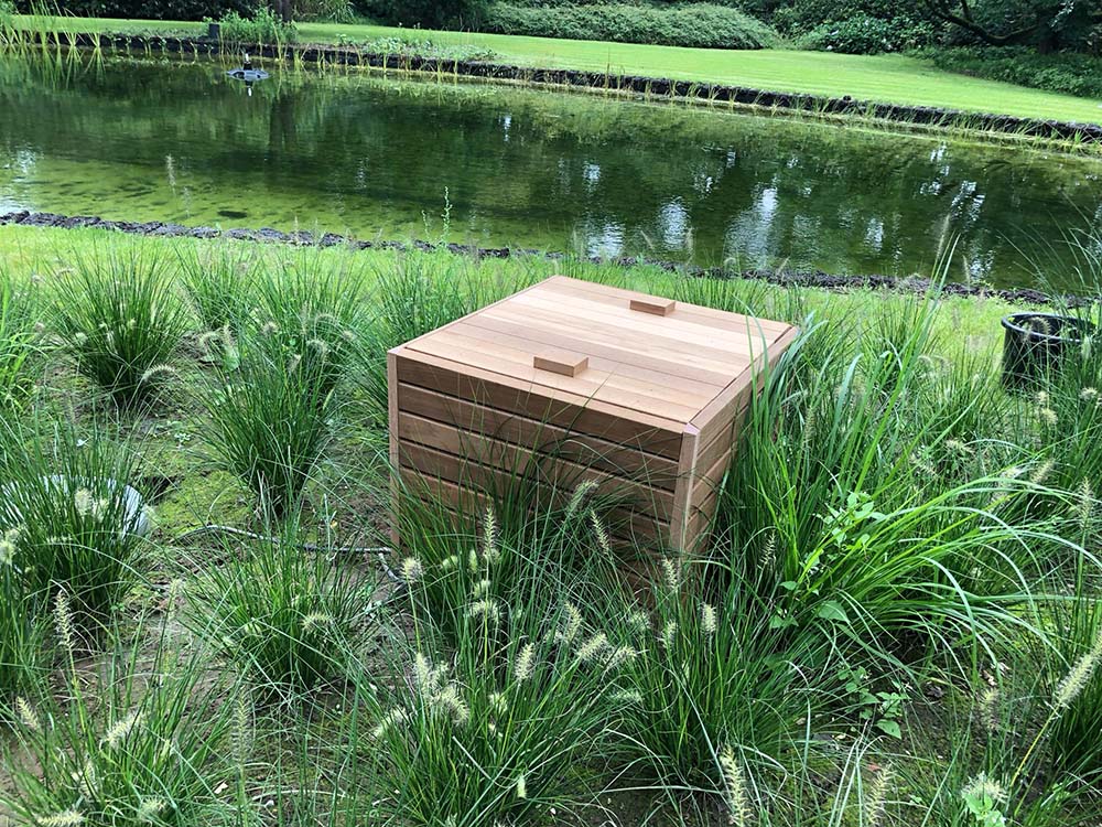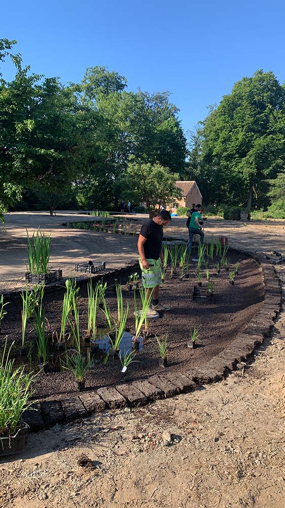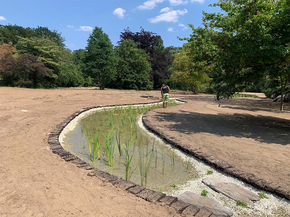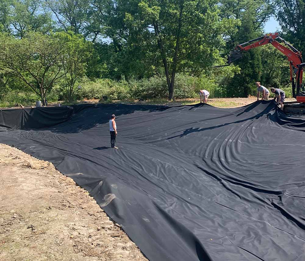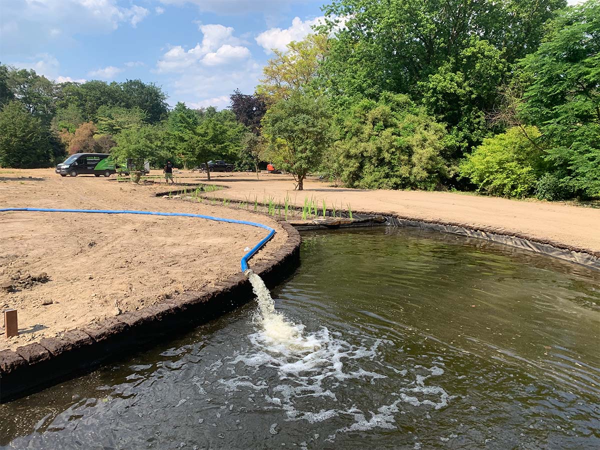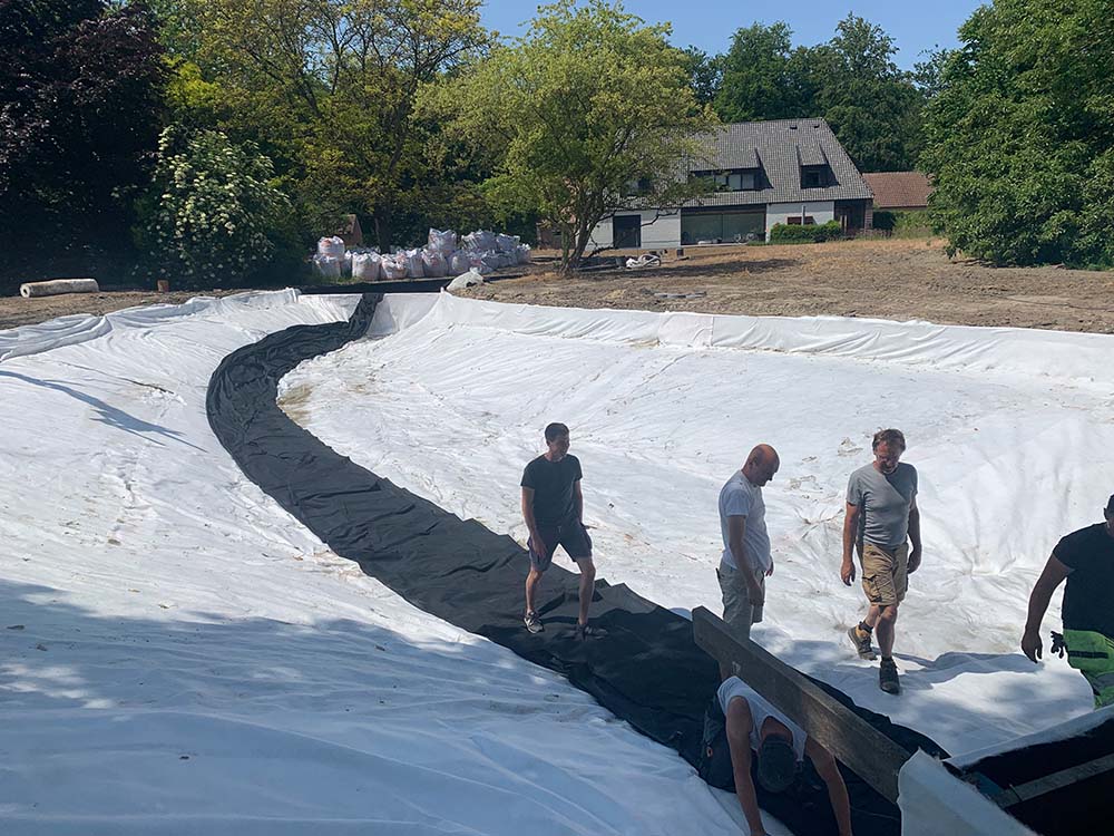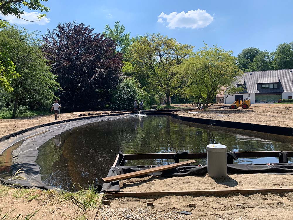 Alle niveaus en randen van de vijver worden nauwkeurig aangepast met behulp van PE-platen, waarbij de randen worden afgewerkt met turfblokken. Deze turfblokken zullen na verloop van tijd onzichtbaar opgaan in de omliggende grasrand, wat zorgt voor een natuurlijke uitstraling.