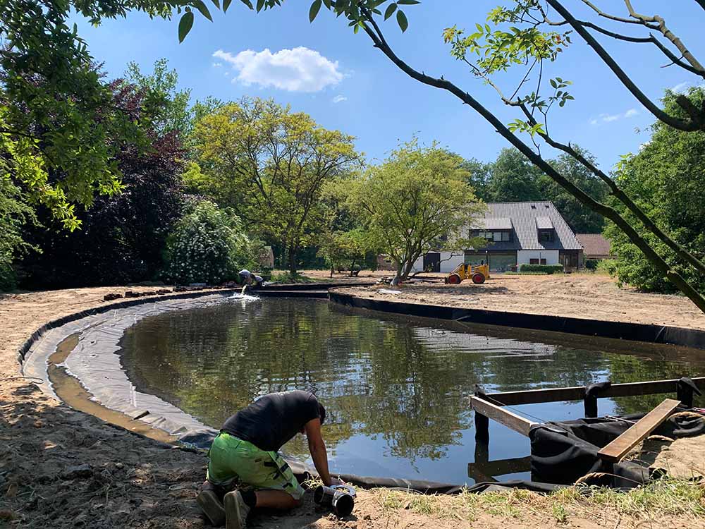 In Aartselaar werd aan het Geopool-team gevraagd om een bestaande vijver te renoveren. De vijver wordt bekleed met op maat gemaakte EPDM-folie, waardoor deze perfect aansluit op de specifieke vormen en afmetingen van de waterpartij.