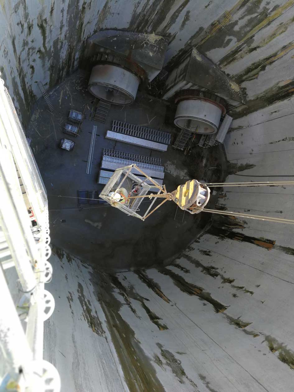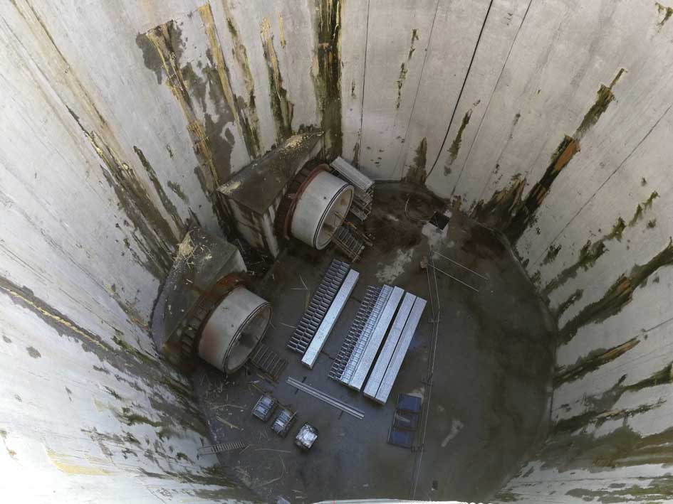 Een technische schacht met een diameter van 20m op een diepte van 35 meter, constructie diepwandfundering in soilmix vertoonde op verschillende plaatsen lekkages. (zie foto 1)