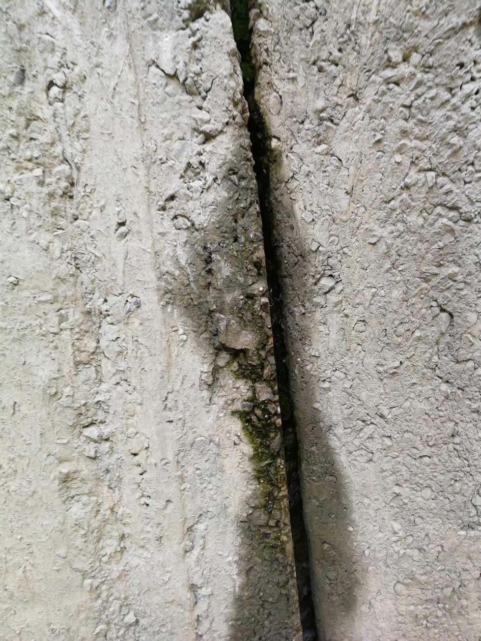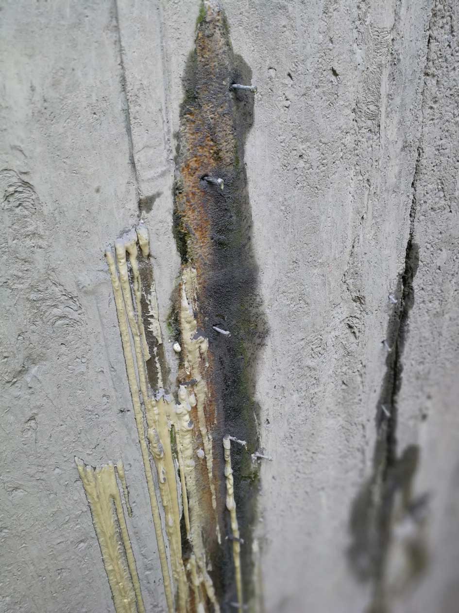 Foto 4 toont een detail van de uitgevoerde injectie De injecties werden uitgevoerd op watervoerende scheuren en werden gedicht door het injecteren van acrylaat gel, in opdracht van de firma Soetaert.
