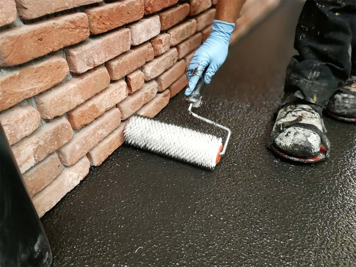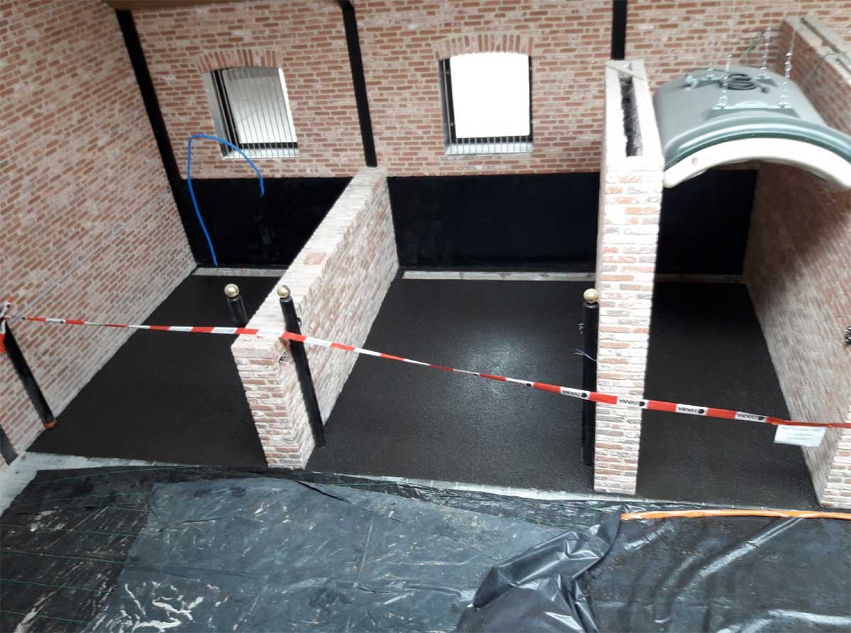 - De polyurethaan gietvloer werd uitgegoten op de beton die eerst voorzien werd van een primer.