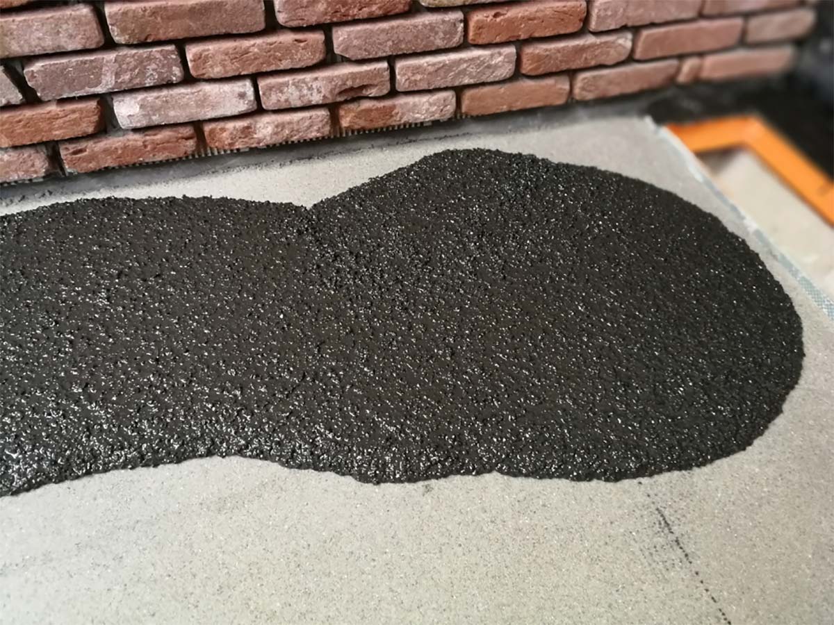 - Detail van het verdelen van de polyurethaan gietvloer alvorens te staffelen.