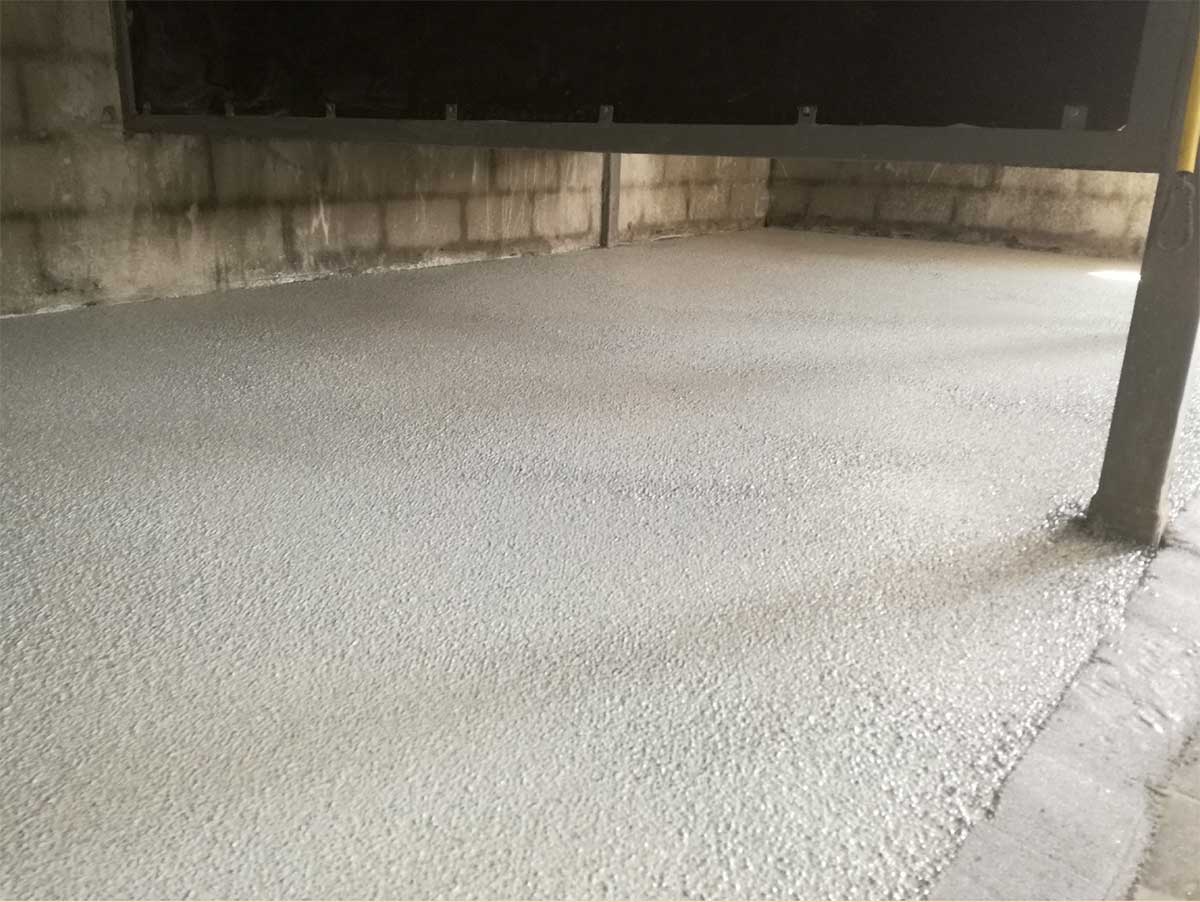 - De bestaande ondergrond, een oude beton met een verzadigde toplaag en sporen van chemische aantasting werd eerst vakkundig verwijderd.