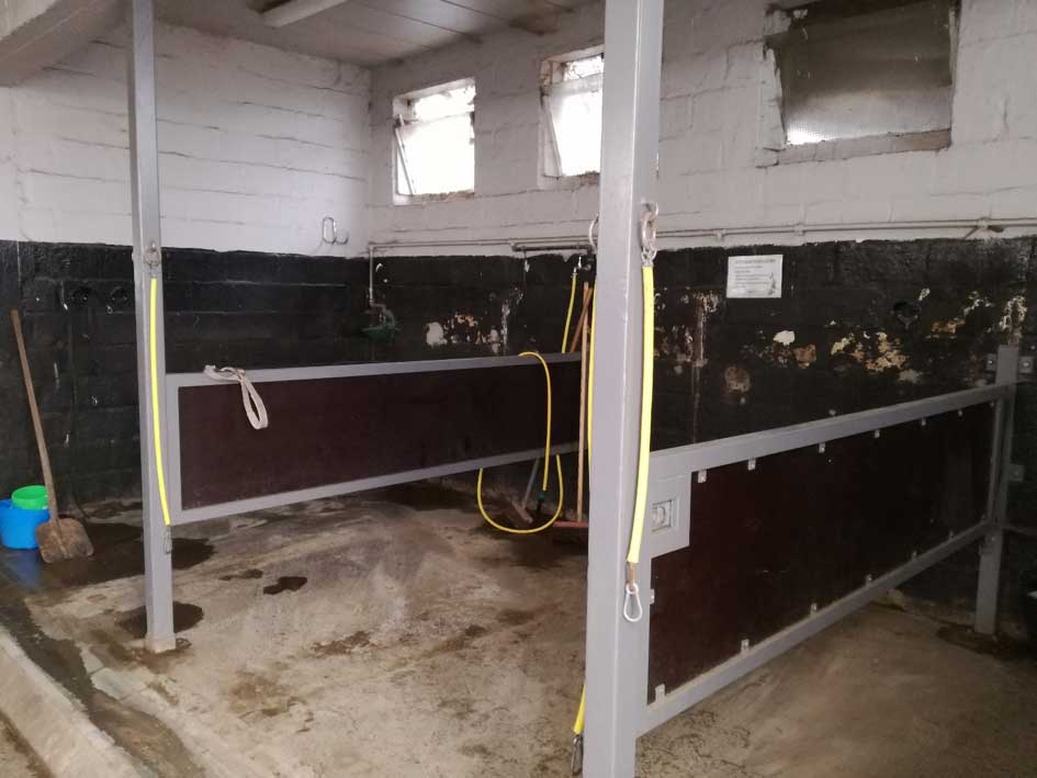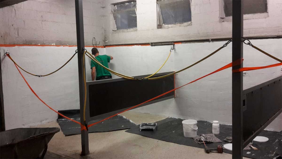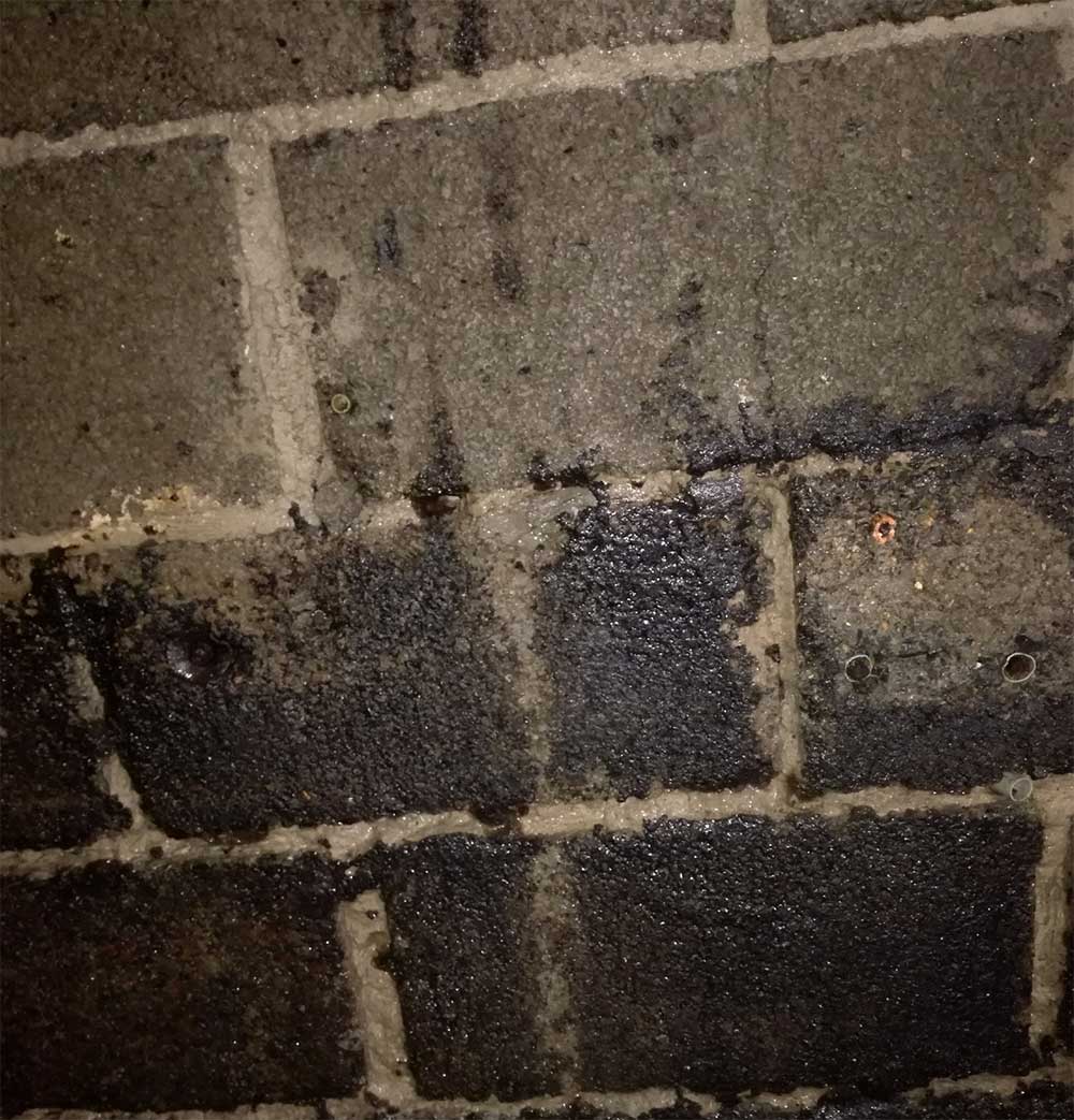 - Op de muren van de stalling werd en oude teerlaag verwijderd.
