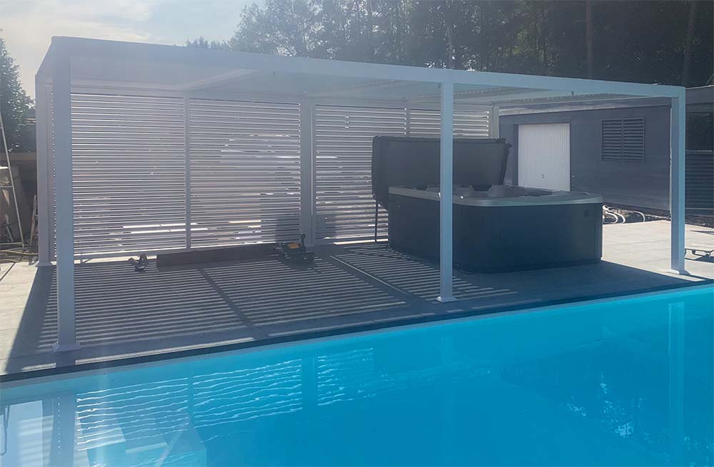 Naast het zwembad hebben we een elegante aluminium terrasoverkapping geplaatst. Deze overkapping is uitgerust met kantelbare lamellen, waardoor je de zon precies zo kunt binnenlaten als je wilt. Overdag geniet je van de zonnestralen die door de open lamellen schijnen, terwijl je 's avonds heerlijk kunt ontspannen in de jacuzzi die onder de overkapping staat.