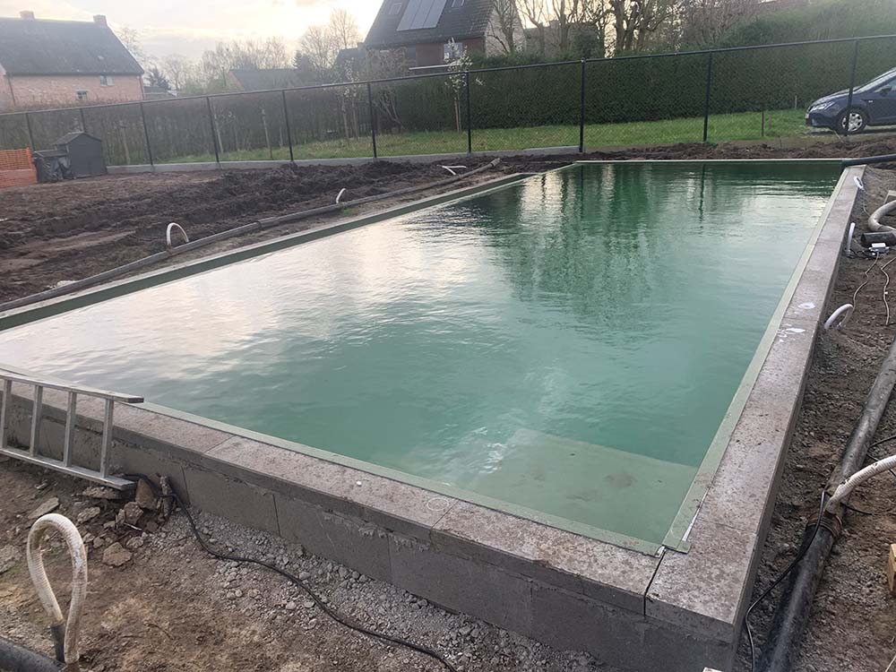 De vijver wordt uitgevoerd in olijfgroene FPP-folie, wat een harmonieuze integratie met de natuurlijke omgeving garandeert. De randen worden afgewerkt met op maat gemaakte keramische boordstenen, uitgevoerd in dezelfde tegels als het terras, waardoor een strak en samenhangend geheel ontstaat.