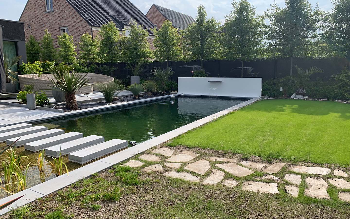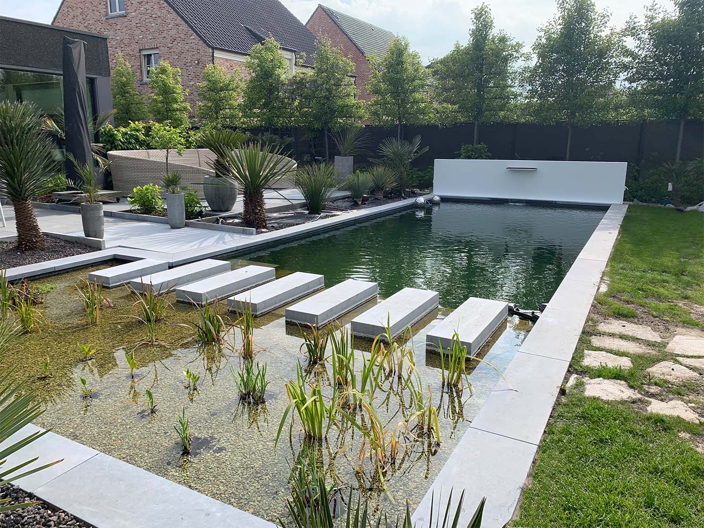 De zwemvijver is uitgerust met een biofilter van 3 bij 5 meter. Stapstenen in blauwe steen vormen de scheiding tussen de filter en de vijver, terwijl ze tegelijkertijd een elegante verbinding creëren met de achterliggende tuin.